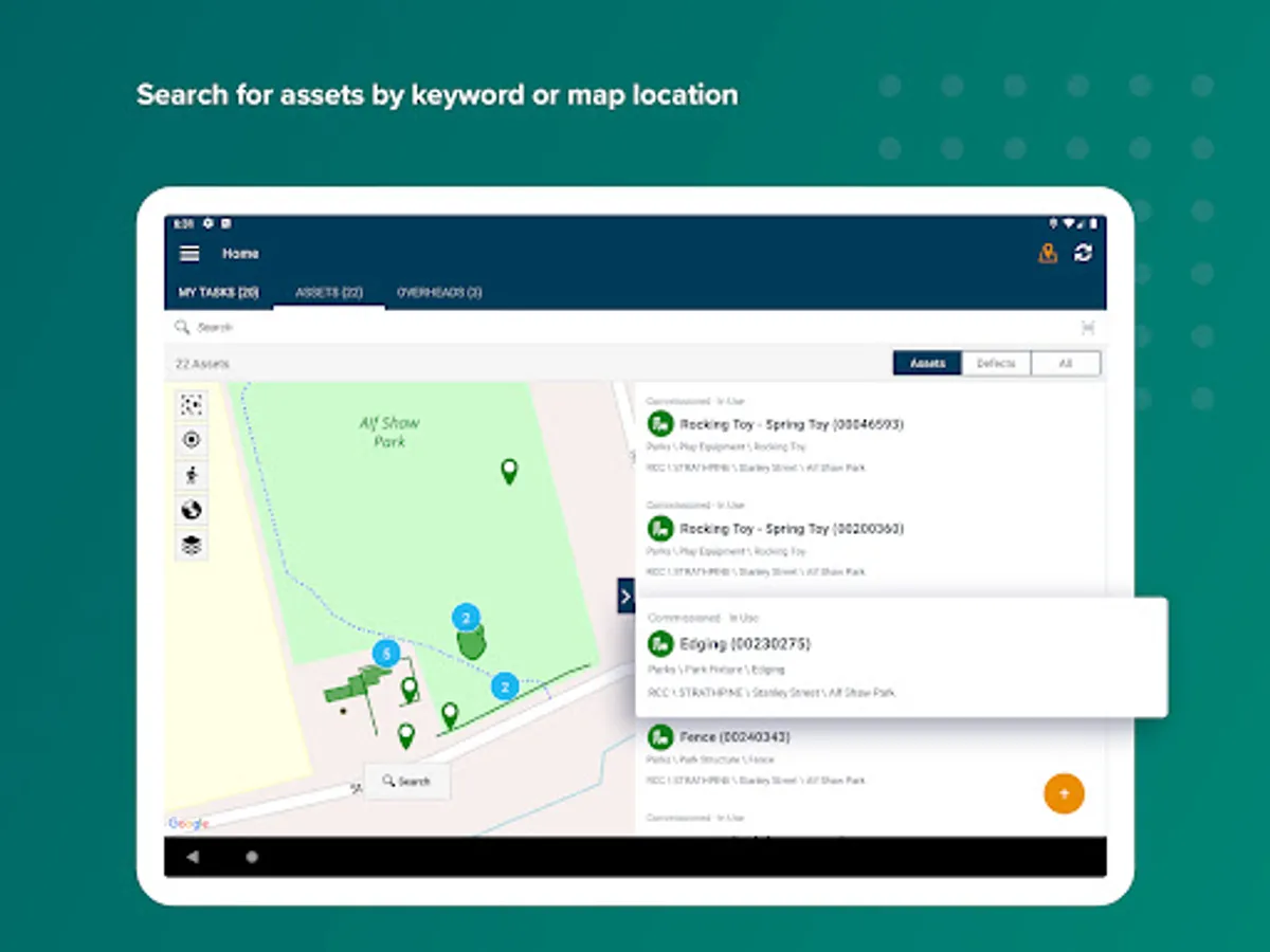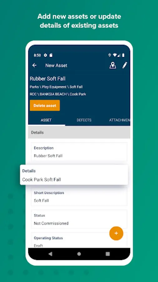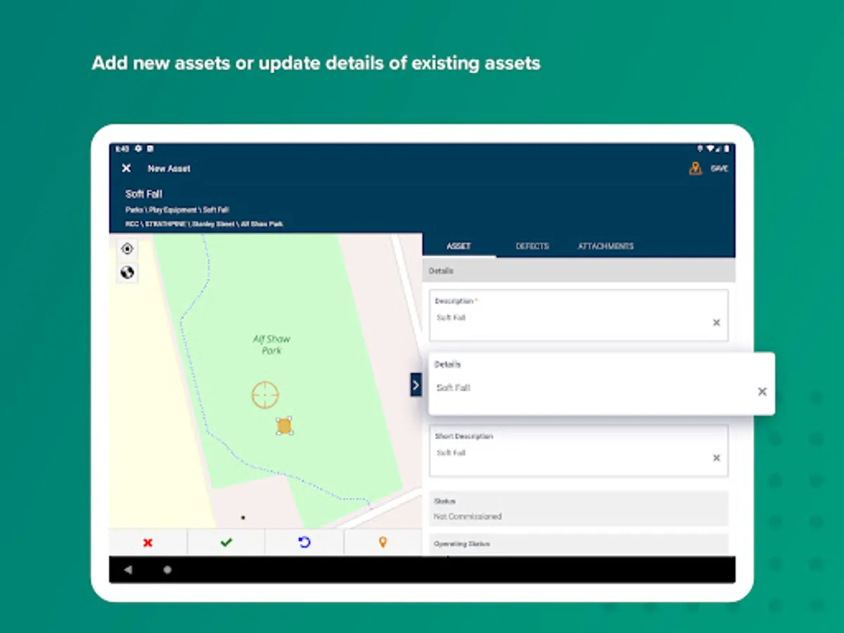 With Field Asset Survey you can search for assets and review and modify assets details in the field. You can also create new assets including adding a spatial location and attachments.