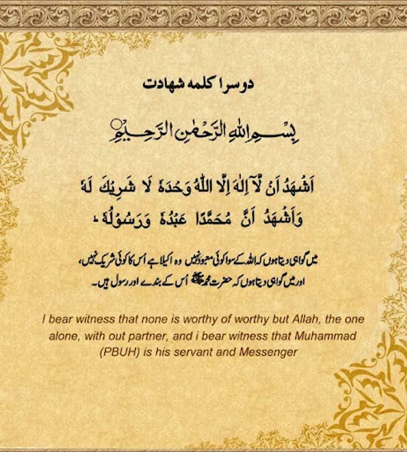 2) Kalma Shaadat: Ashahado An Laa ilaaha illal Laho Wahdahoo Laa Shareeka Lahoo Wa Ash Hado Anna Mohammadan Abdo Hoo Wa Rasoolohoo.