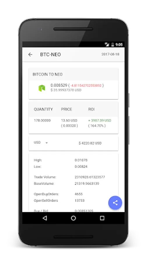 Using this app you can check live price of more than 800 cryptocurrency / coins. You can check the volume trade, open buy and open sell requests, latest bid / ask price.