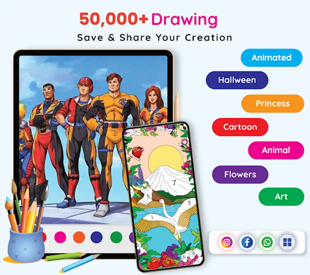 - Quick sharing: color by numbers and post number coloring artworks on all social networks and share with friends and families.