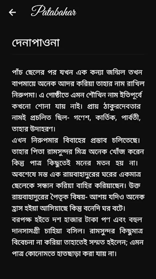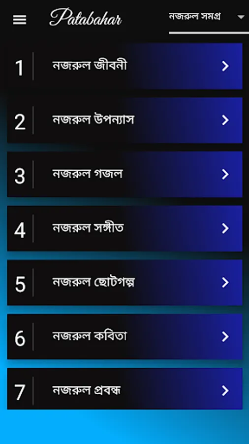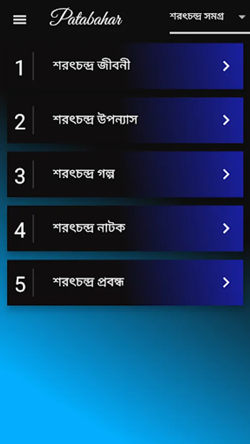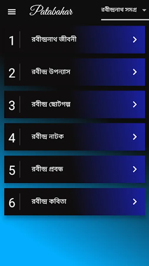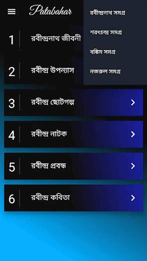 Rabindranath Tagore, Saratchandra Chattopadhyay, Bankimchandra Chattopadhyay, Kazi Nazrul Islam Biographies of all these writers, compositions (poems, novels, short stories, plays, essays, music, ghazals) are all divided into paragraphs in the table of contents for the convenience of reading in just one app. .