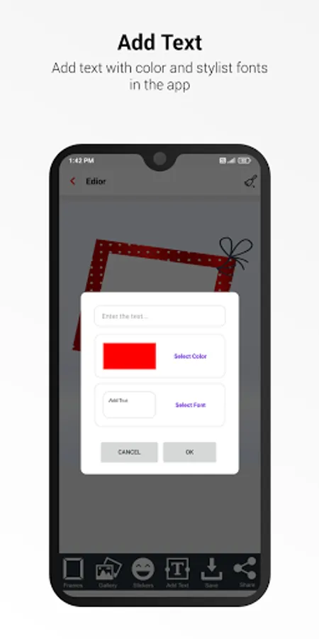 You can create your own photo frames with multiple stylish options like set background image using a camera or gallery and also use predefined background images, change the font, text size, text colour & more.