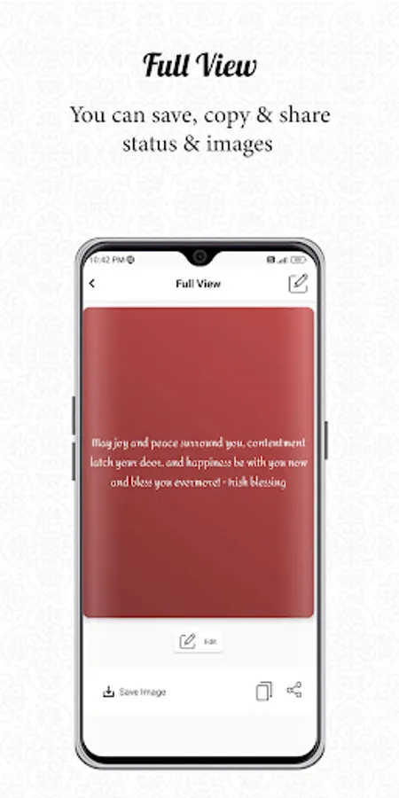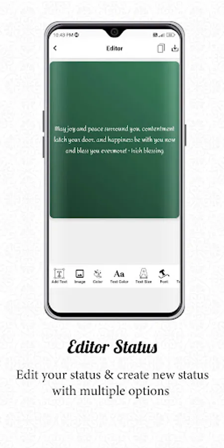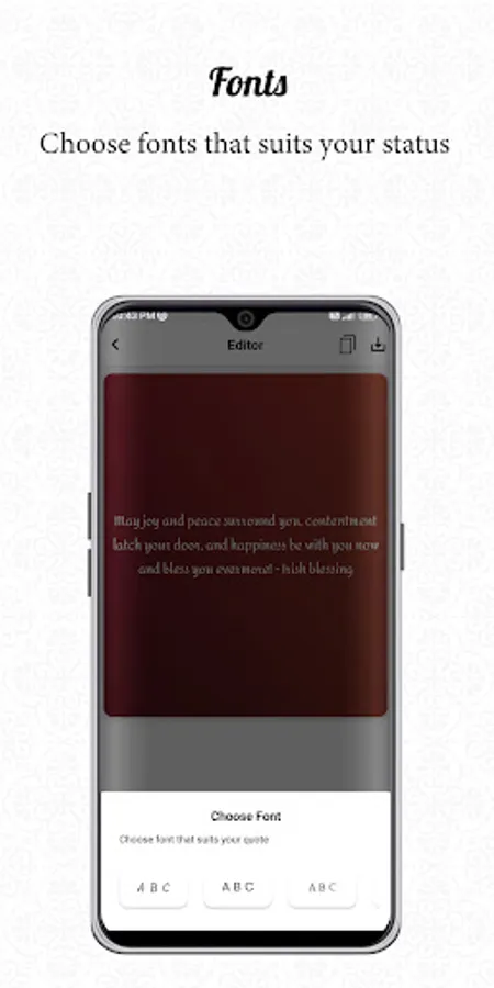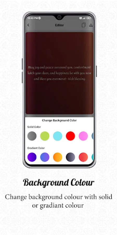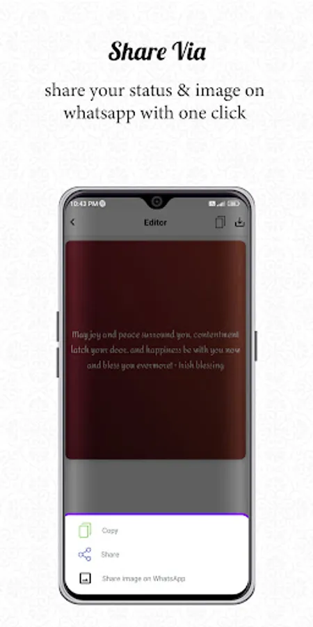 You can create your own Wishes, quotes and messages with multiple stylish options like set background image using camera or gallery and also use predefined background images, change the font, text size, text colour & more.