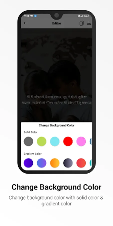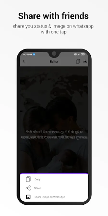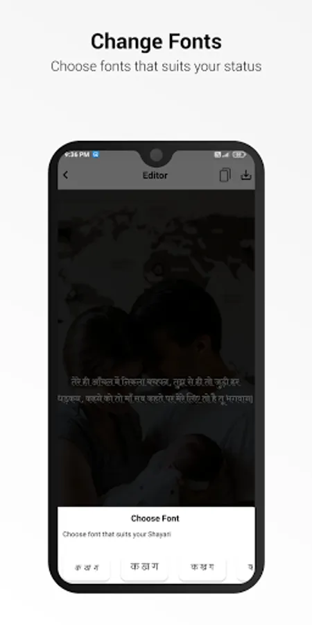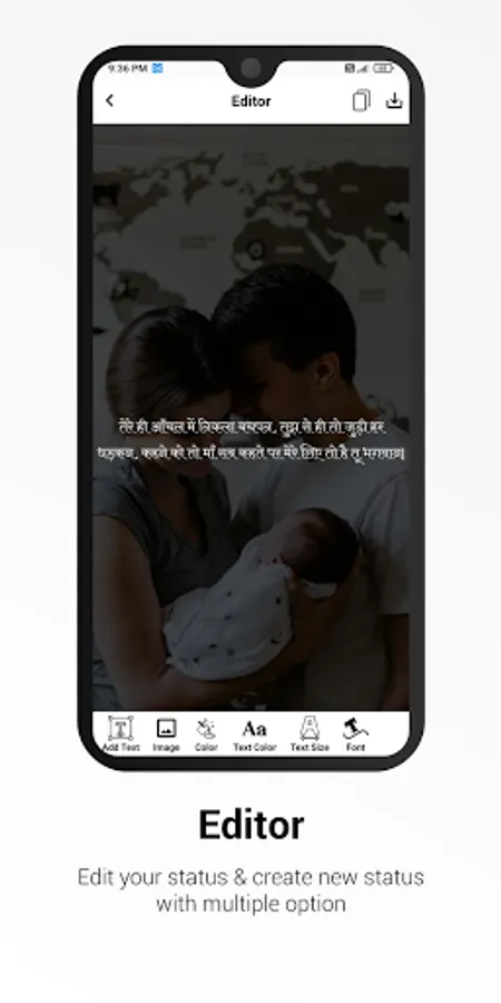 You can create your own status, quotes or Shayari with multiple stylish options like set background image using camera or gallery and also use predefined background images, change the font, text size, text colour & more.