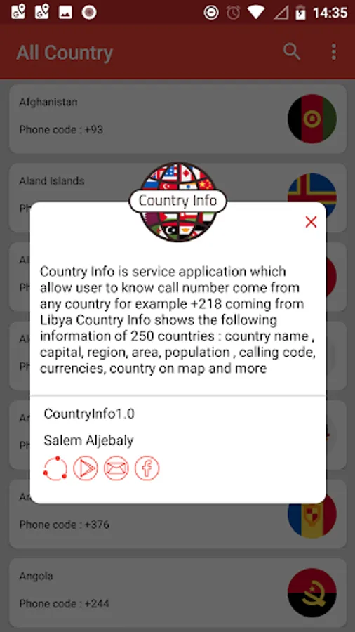 Country Info is service application which allow user to know call number come from any country for example +218 coming from Libya.