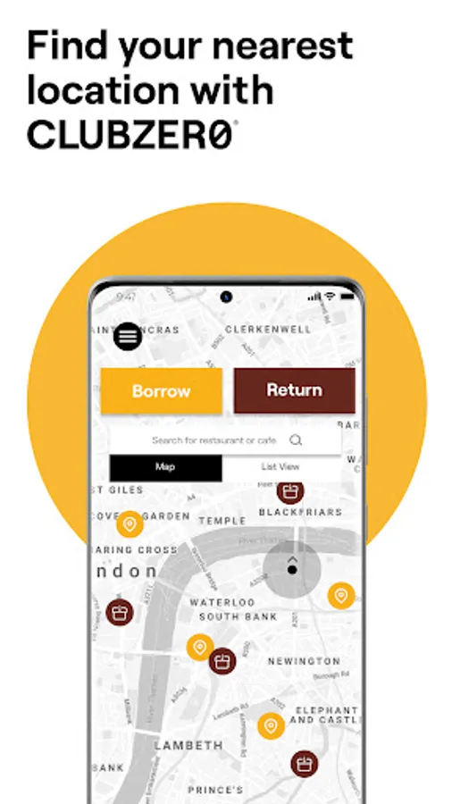 1.BORROW - Find nearest host location in the CLUBZERØ® app to access reusables in-store or takeaway or order online delivery.