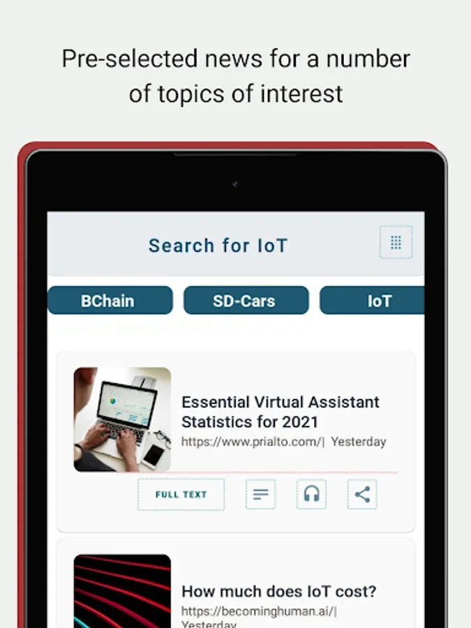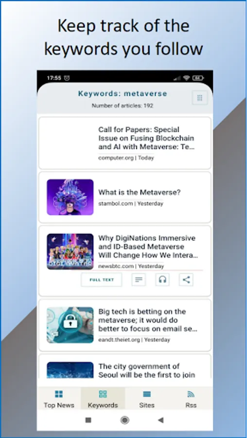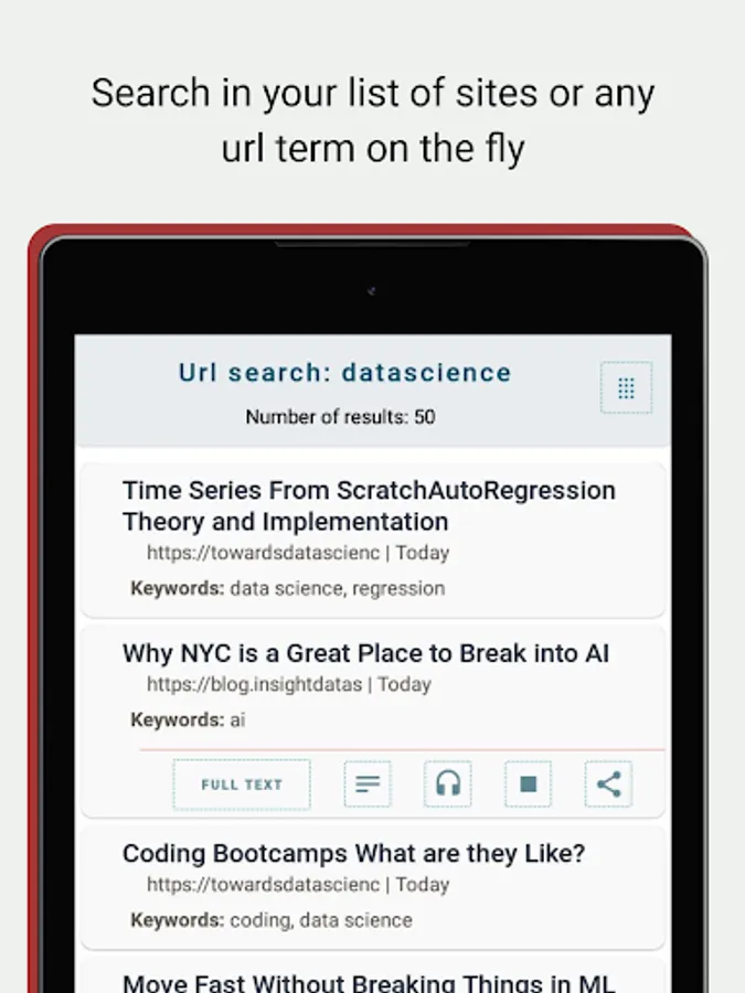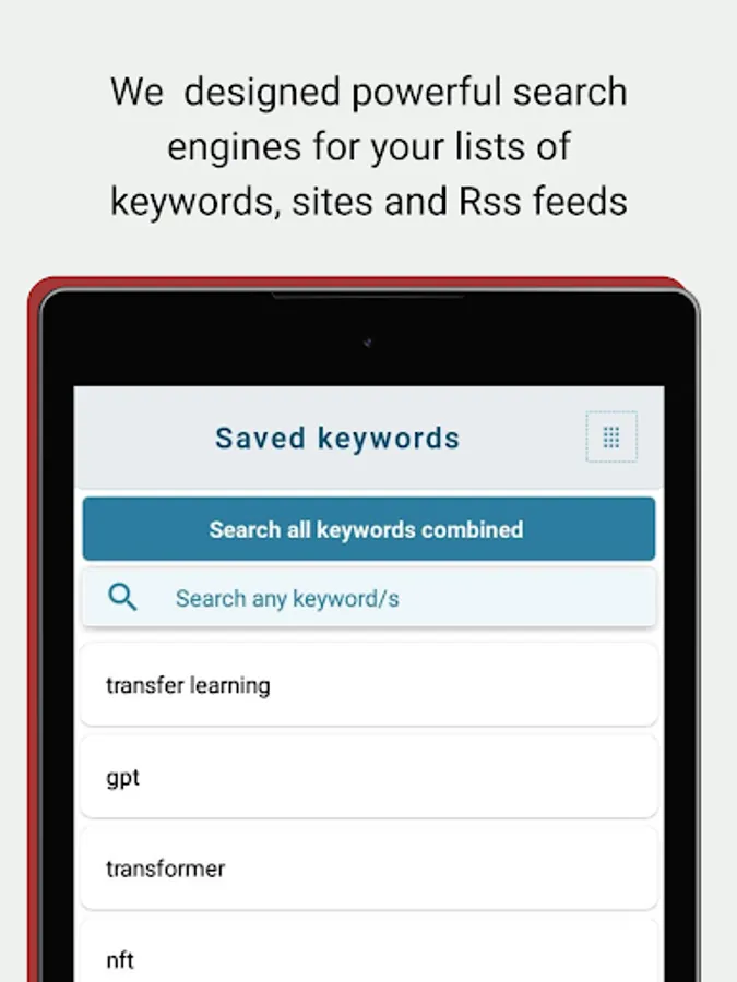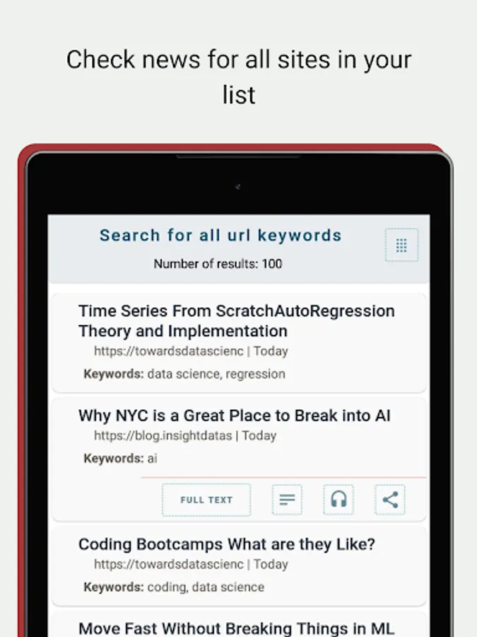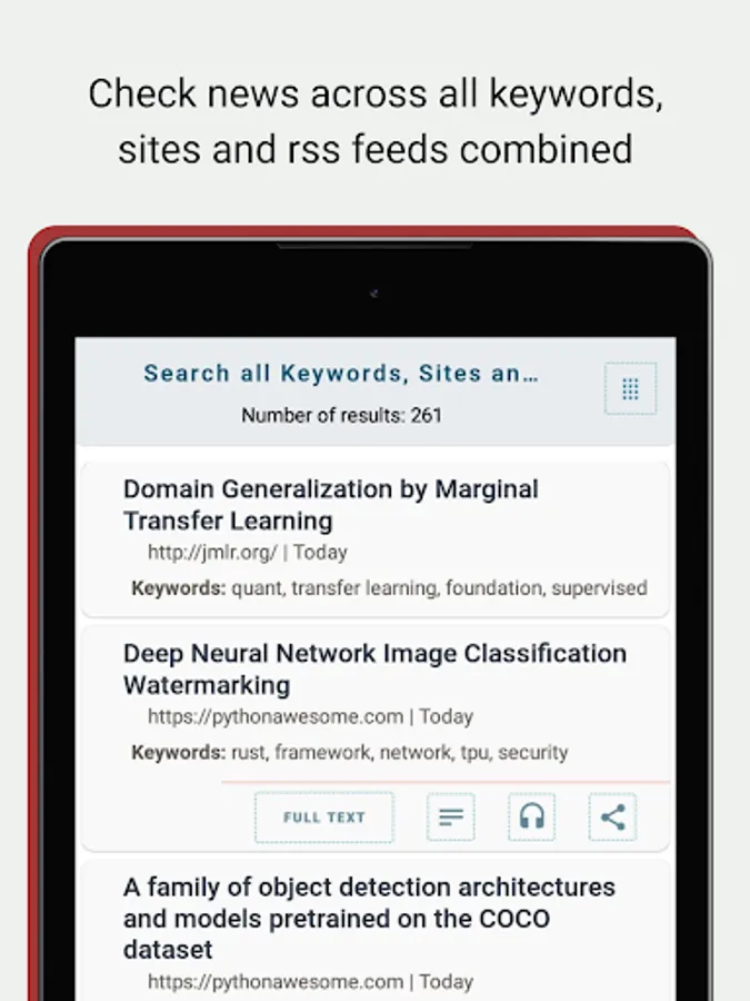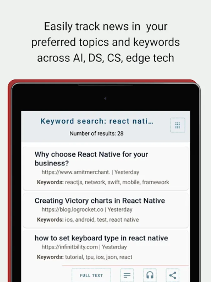 App design is keyword-centric, so that topic-aware readers can enjoy a set of handy tools to access, build, and manage lists of keywords, sites, and news feeds. App users can explore a wealth of information from countless web sources in a couple of clicks or just check the news for the topics and keywords in their list. Content discovery is facilitated by news summaries, provided in text or text-to-speech formats.