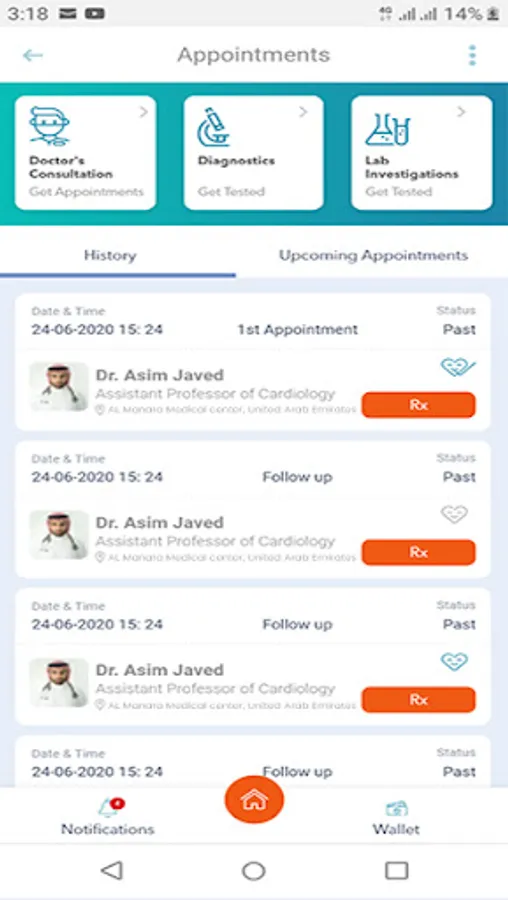 Appointments: This act as a reminder for patient’s all incoming appointments of Dr Consultation, Diagnostics and Investigations along with history of appointments