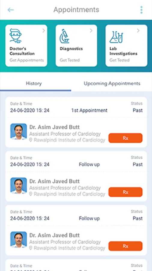 Appointments: This act as a reminder for patient’s all incoming appointments of Dr Consultation, Diagnostics and Investigations along with history of appointments