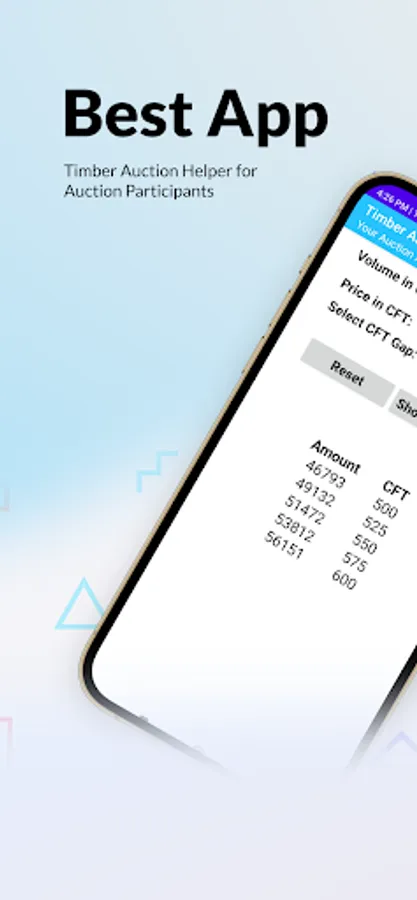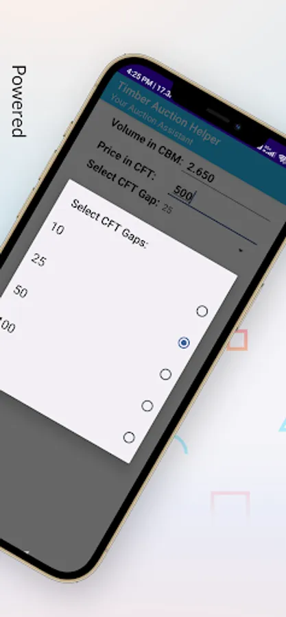Timber auction helper can ease your burden, by doing all the calculations for different CFTs in the gap of 10, 25, 50, 100, and 250 from the entered volume in Cubic Meters. It will also auto-calculate the amount for price per CFT.