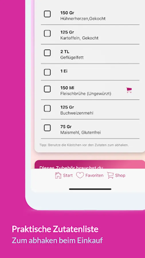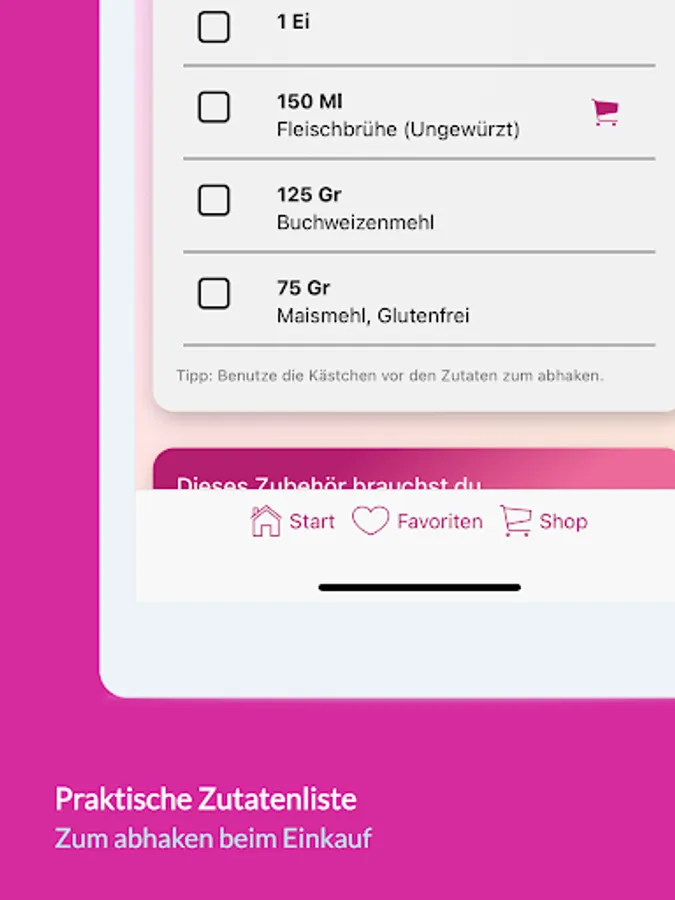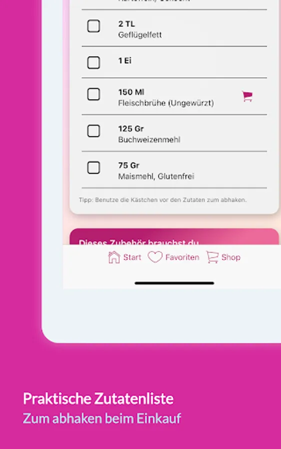 * Checklist feature for accessories and ingredients for easy ticking and shopping