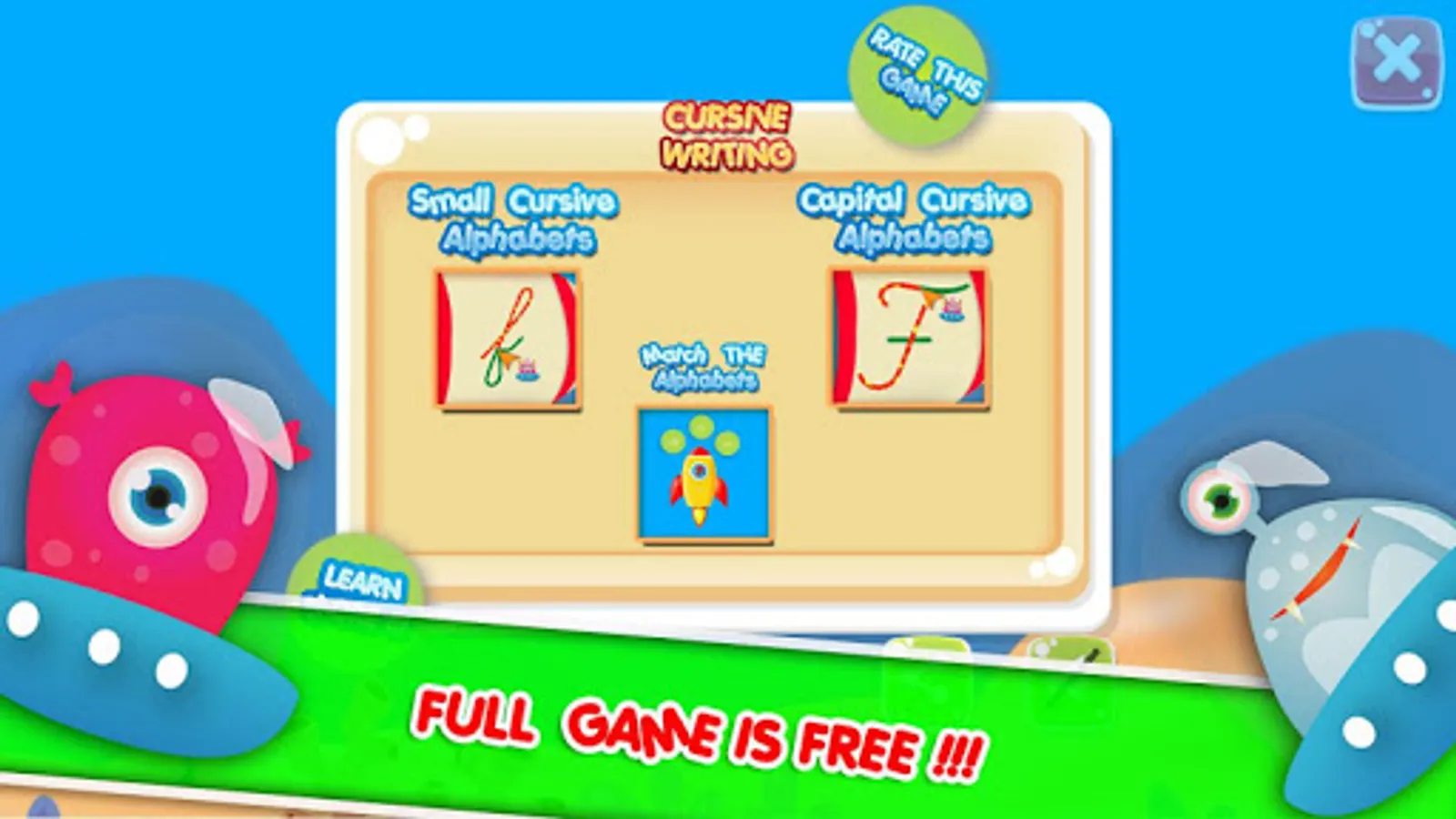 We know cursive alphabets is probably one of the complicated for your kids to learn, and this is exactly where our game comes into the picture; trace alphabet throughout the levels with all cursive strokes there is in the english alphabet!