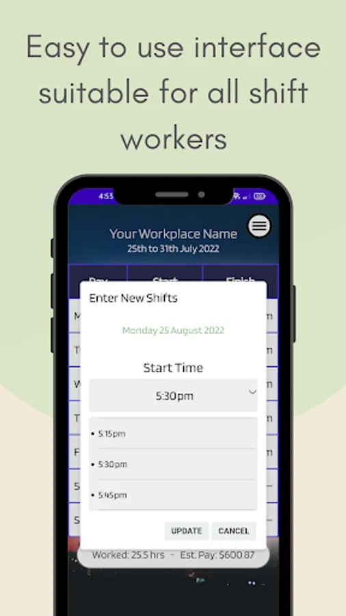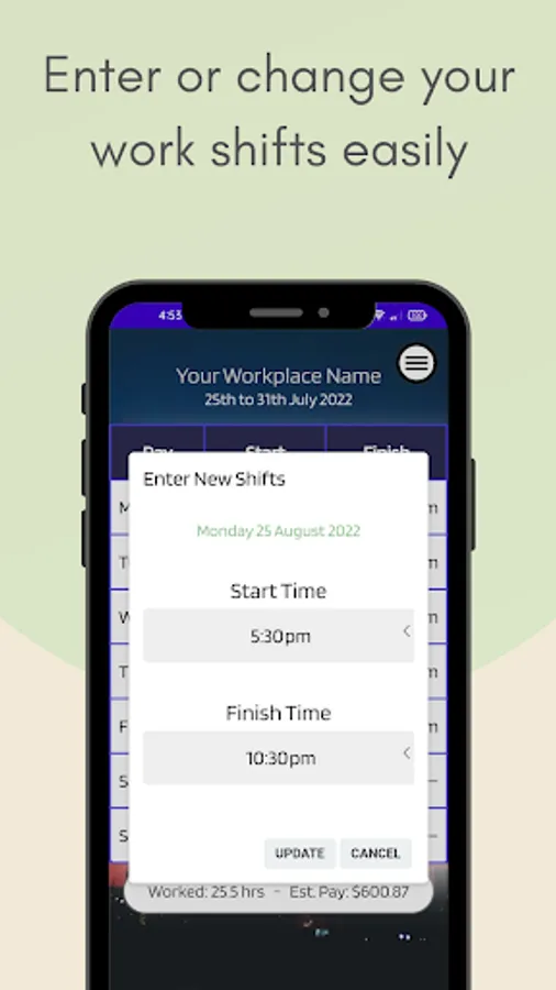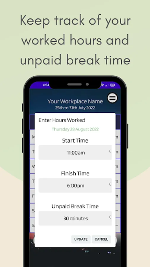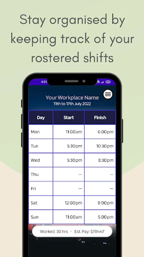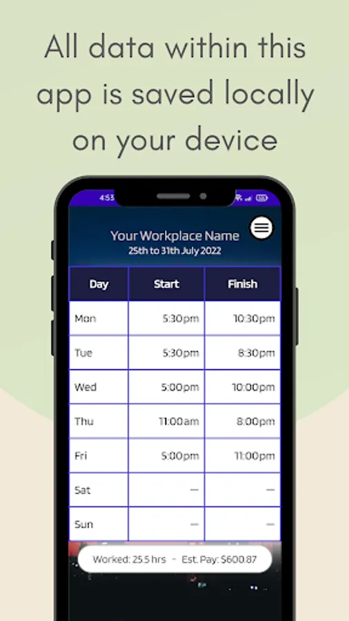 The app will automatically calculate the total number of hours you have worked within the week when you update your actual hours worked for each of the days of the week. You can also set your pay rate where it will give you an estimated pay for the week.