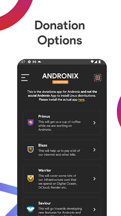 This is the donations app for Andronix and not the actual Andronix App to install Linux distributions. Please install the actual app from- https://play.andronix.app.