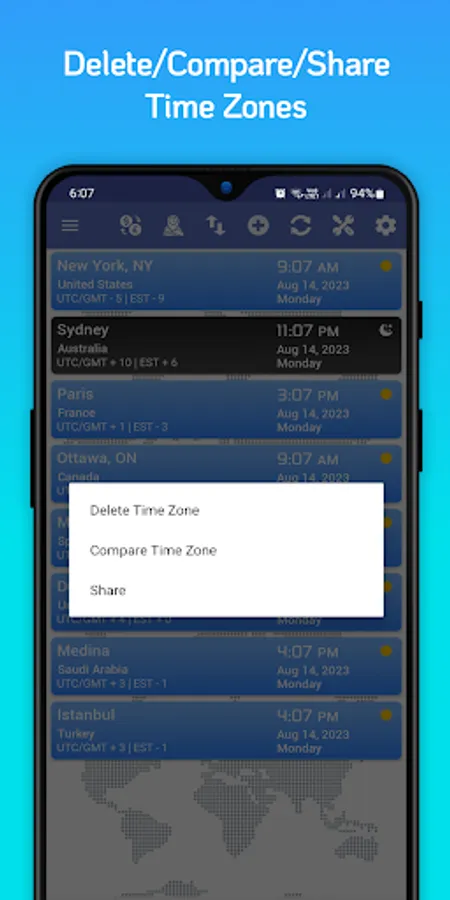 Type Different Time Zones Converter - World Clock Time Now in a search box of play store and install.