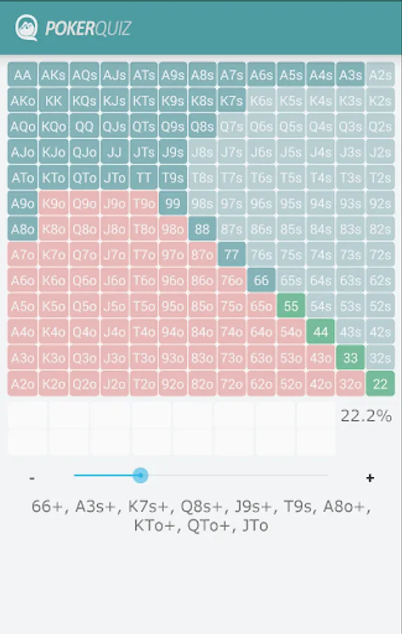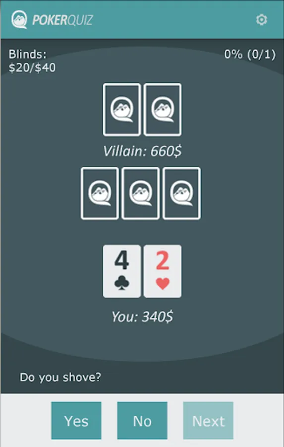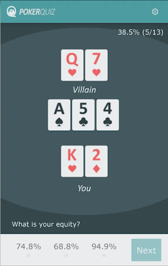 PokerQuiz is a simple and lightweight poker trainer with two different modes - the Equity Quiz mode and the Nash Quiz mode. The Equity Quiz mode will improve your intuition about the equity on different streets. Nash Quiz mode will help you learn the Heads-Up Equilibrium table. You will definitely get better at poker by using PokerQuiz!