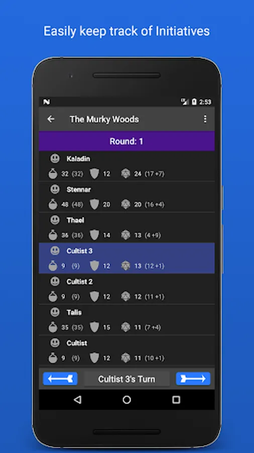 Players, monsters and NPCs are all ordered according to their initiative rolls (conflicts are resolved with the higher modifier going first). The name of who's turn it is currently is shown and turns can be advanced or reversed using the buttons at the bottom. For interactions tap on the effected player, monster or NPC in the list and enter the type and amount.