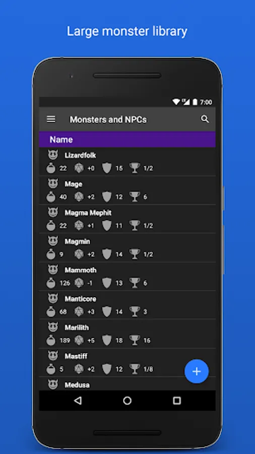 • Easily find and add multiple monsters and NPCs using the searchable list. Includes a large list of monsters from the D&D Systems Reference Document (SRD) to get you started with support for adding more.