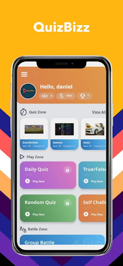 QuizBizz ist ein Quiz-Spiel. Zocke gegen deine Freunde oder mit anderen Leuten aus Deutschland, Österreich oder der Schweiz. Natürlich kannst du auch gegen einen Bot spielen. Gewinne Punkte bei verschiedenen Event basierten Wettbewerben.