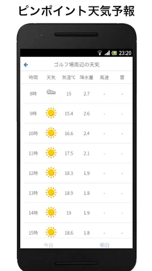 その他、便利なゴルフ場の1時間ごとのピンポイント天気予報も確認できます。