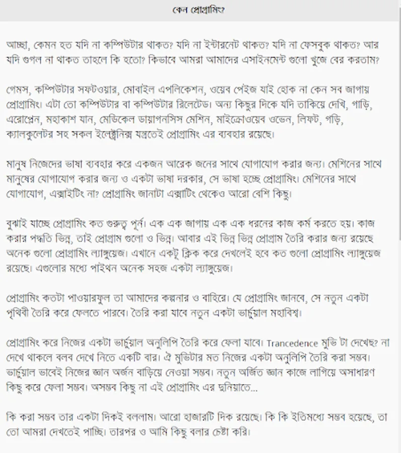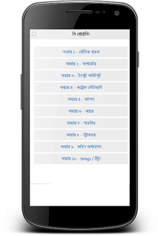বাংলায় সি প্রোগ্রামিং শেখার জন্য বই এর অ্যাপ ভার্সন। সহজেই C Programming শেখার জন্য এবং ইন্টারনেট ছাড়াই প্রোগ্রামিং শেখার জন্য সি প্রোগ্রামিং বইটির অ্যাপ তৈরি করা হয়েছে। এতে রয়েছে নিচের বিষয় গুলোঃ