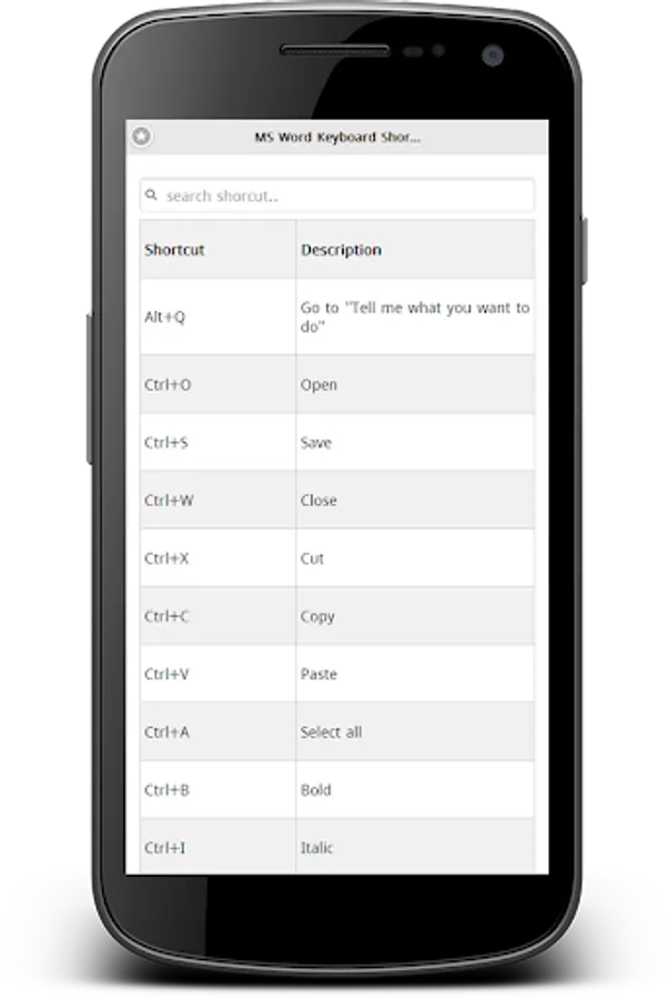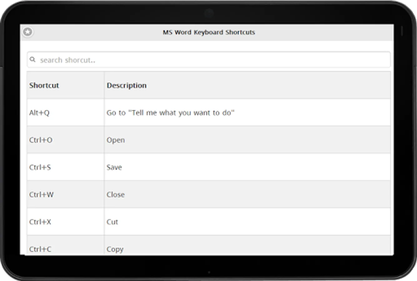 MS Word Keyboard Shortcuts is a simple app with all essential keyboard shortcut for Microsoft Office Word. When you work with Microsoft Word, you can check shortcuts and increase your productivity.