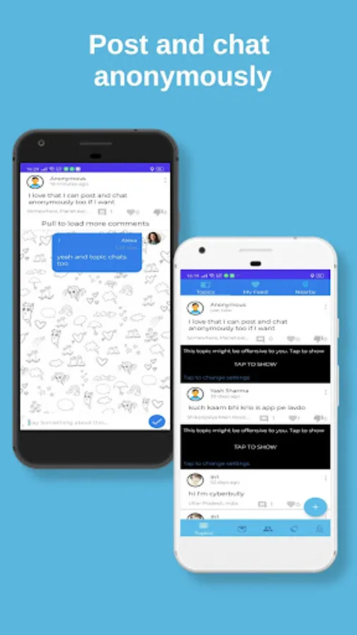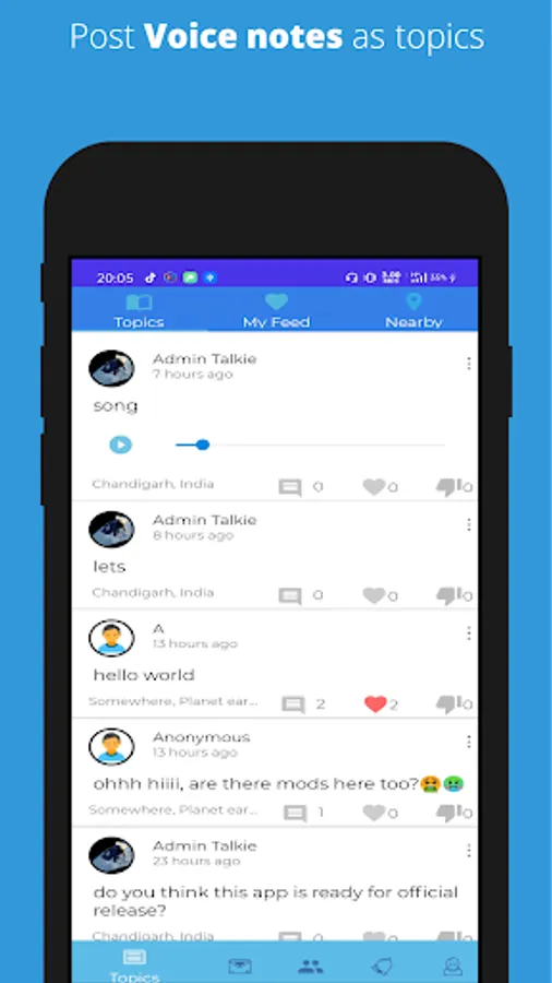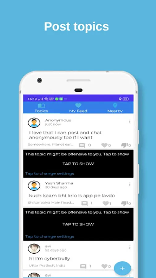On Talkie, you can post topics and get views about your topic from all the users across the globe. You can hide your identity by posting topics anonymously or choose to share your views without hiding your identity.