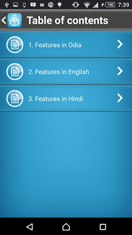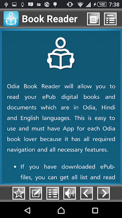 Odia Book Reader will allow you to read your ePub digital books and documents which are in Odia, Hindi and English languages. This is easy to use and must have App for each Odia book lover because it has all required navigations and all necessary features.