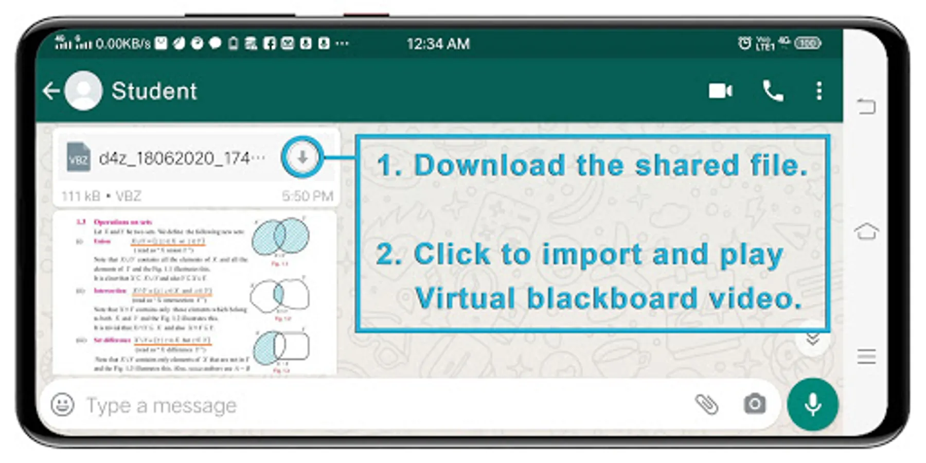 - Download the shared Virtual Blackboard file from WhatsApp and then click on the file to import and view them on App.