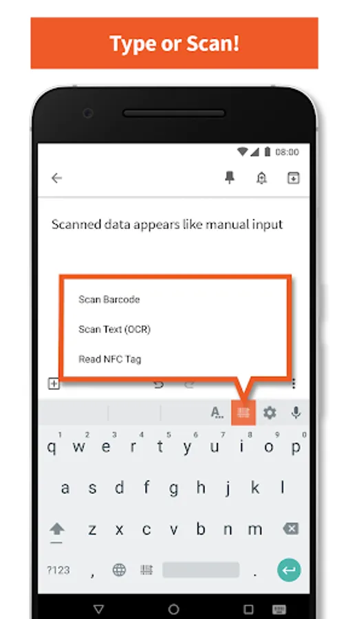 Use this innovative soft-keyboard to scan barcodes, QR codes, text (OCR) and NFC tags into any app. Invoke the integrated scanners with a single tap, the scanned data appears immediately in the target app like manually typed on the keyboard. This works perfectly with almost any target app without modifications.