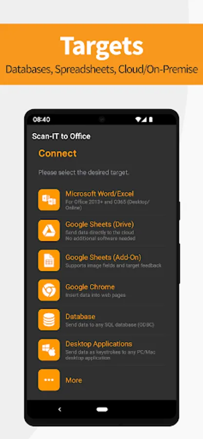 The mobile scanning and data acquisition app Scan-IT to Office instantly provides access to remotely scanned or captured data in SQL databases, Microsoft Excel/Word, Google Drive/Sheets, and desktop apps. Whether scanning barcodes, QR codes, NFC tags one-by-one or in bulk, or filling input forms, the data is readily available for further processing.