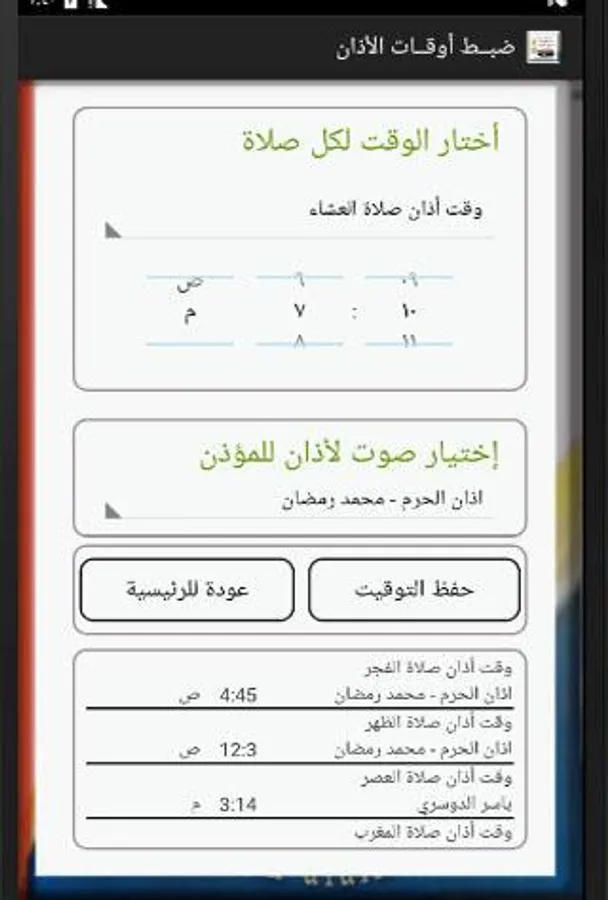 An alarm for the time of the five prayers is set by the user according to his country and city and choose the voice of the muezzin who wants from among the voices of the accomplices attached to the application.