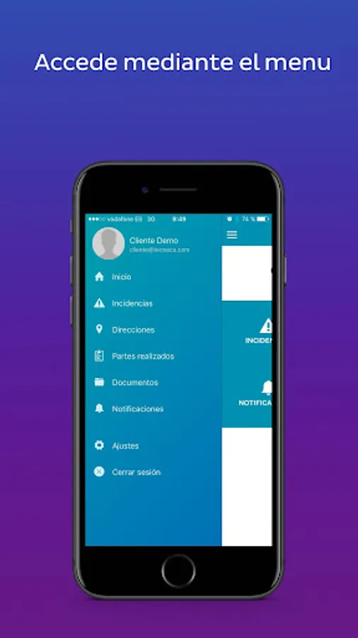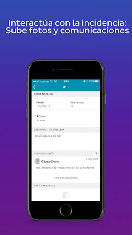 With the APP client for mobile CLOUD GMAO end of service providers customers can consult the parties of action, incidents and states even communicate quickly and effectively in each of the incidents.