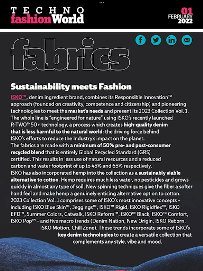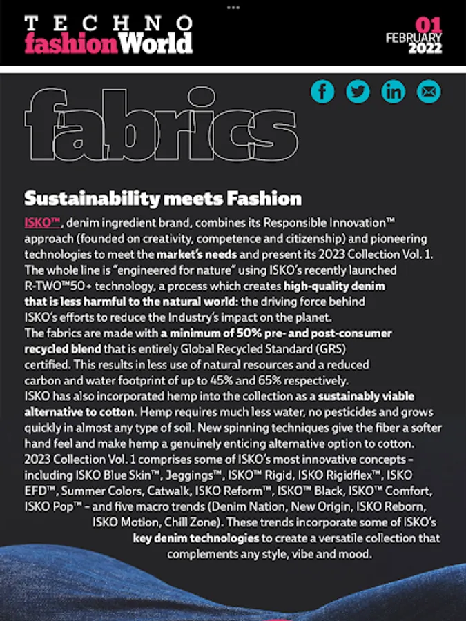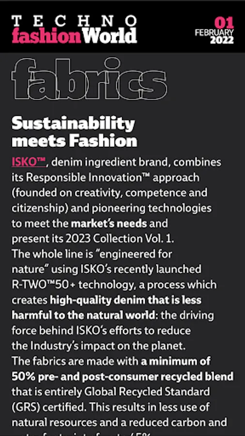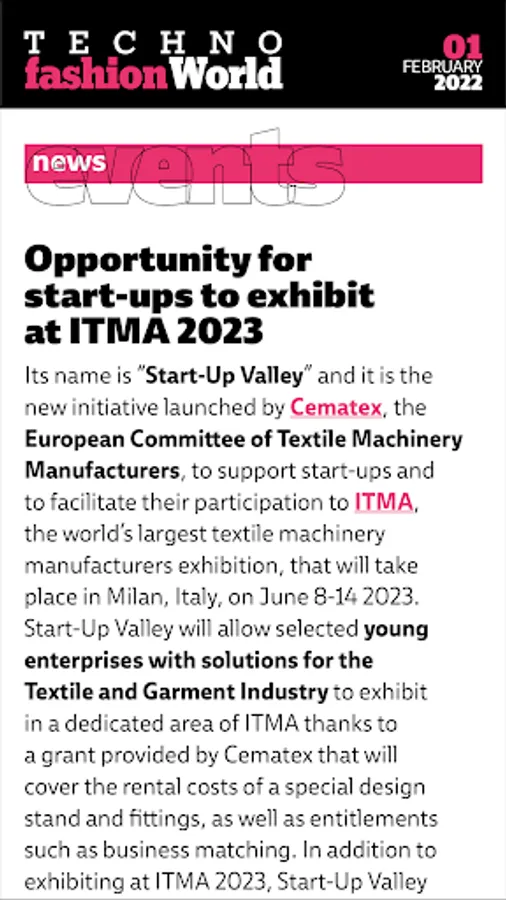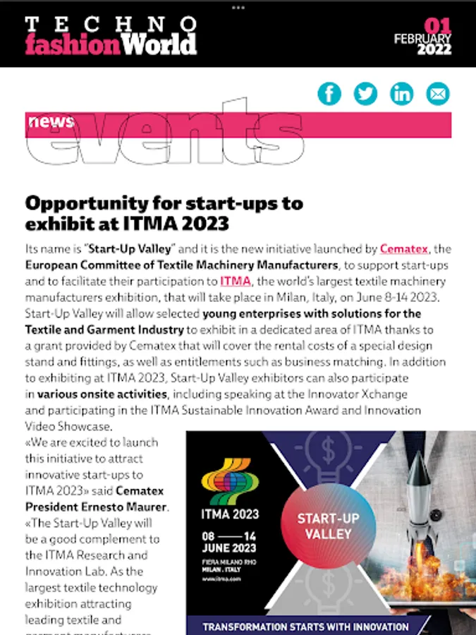 Technofashion is the only integrated multi-channel platform (print magazine, website, social network and all other digital interaction tools) of reference for technologies of Textile & Fashion Apparel.