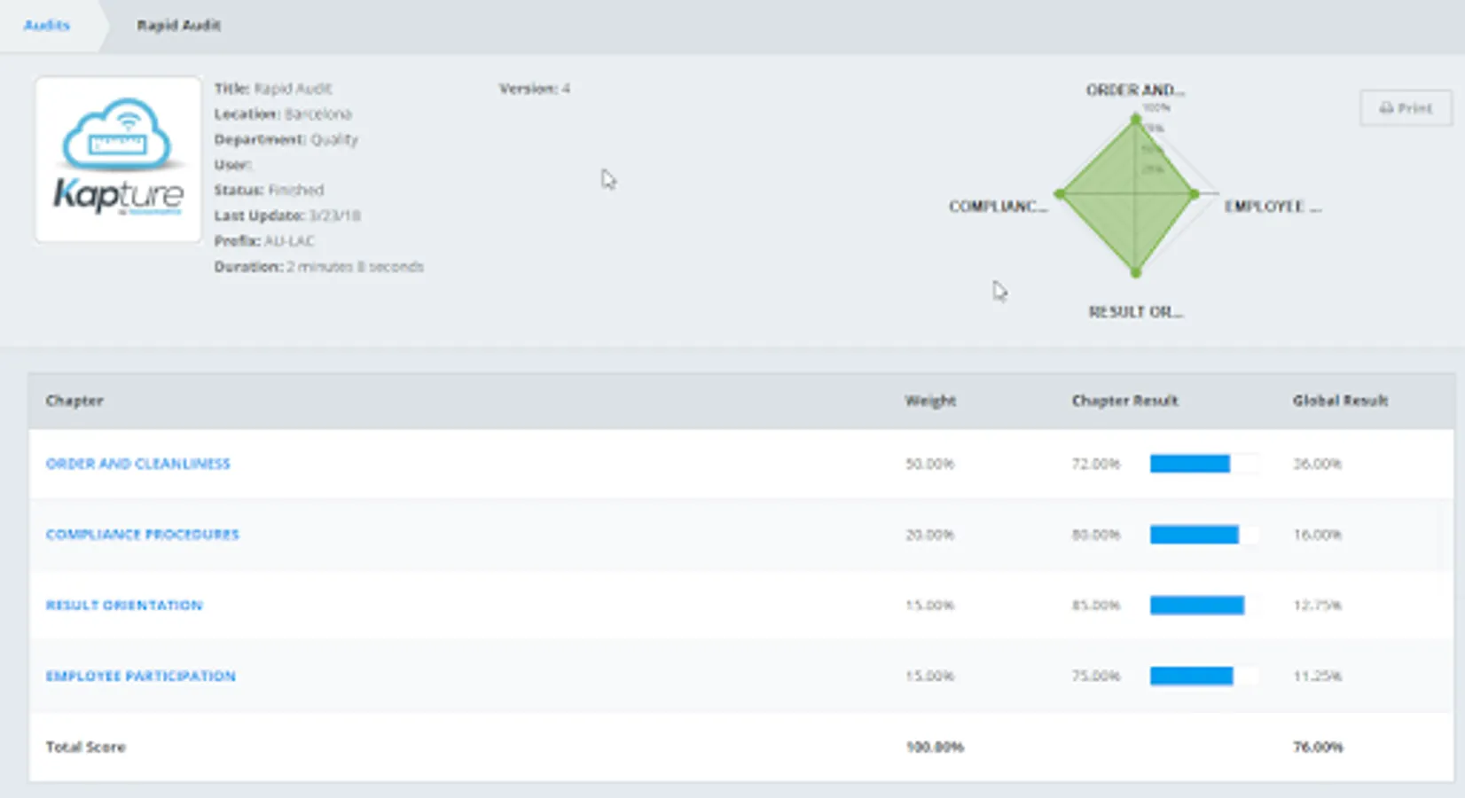 Once the Audits have been executed, the results can be viewed, printed and shared in Kapture.io. As well as standard location based Audits, Global multi-plant audits can be managed by configured by administrators . For more information contact us via the kapture.io or your support page.