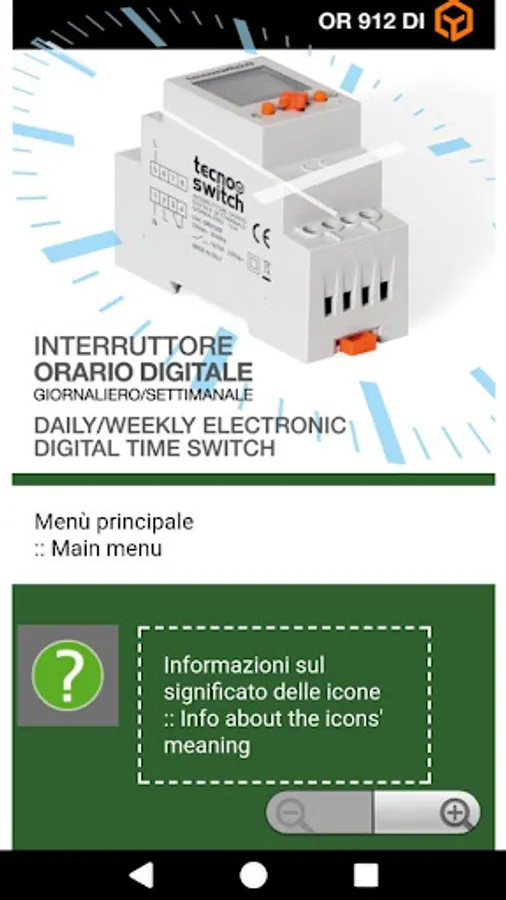 This App lets you program the weekly clock 1 OR912DI channel Techno Switch Srl in simple and intuitive way. All during insertion and modification of the times for each day of the week can be done on your smartphone while sitting on the couch. The programming can be saved as files on the phone, and then subsequently transferred to the device in a few seconds, via a WiFi connection. The OR912DI clock behaves like a real "hot-spot", so it is not necessary that the room where it is installed there is no other connection WiFi or Internet. The connection is made directly between the smartphone and the device. The activates its WiFi Alarm pressing a small button or joystick and automatically turns off after 5 minutes of inactivity in order to ensure greater security and it does not emit RF energy when not needed. The application is free. The manual full use can be downloaded from the company's website.