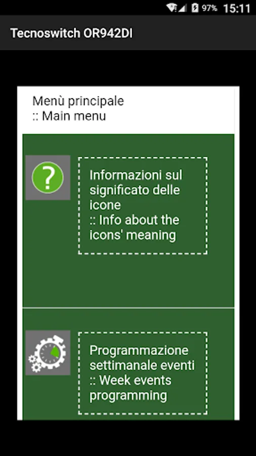 This App lets you program the weekly clock 2 OR942DI channels of Techno Switch Srl in simple and intuitive way. All during insertion and modification of the times for each day of the week and the holiday can be done on your smartphone while sitting on the couch. The programming can be saved as files on the phone, and then subsequently transferred to the device in a few seconds, via a WiFi connection. The OR942DI clock behaves like a real "hot-spot", so it is not necessary that the room where it is installed there is no other connection WiFi or Internet. The connection is made directly between the smartphone and the device. The activates its WiFi Alarm pressing a small button or joystick and automatically turns off after 5 minutes of inactivity in order to ensure greater security and it does not emit RF energy when not needed. The application is free. The manual full use can be downloaded from the company's website.