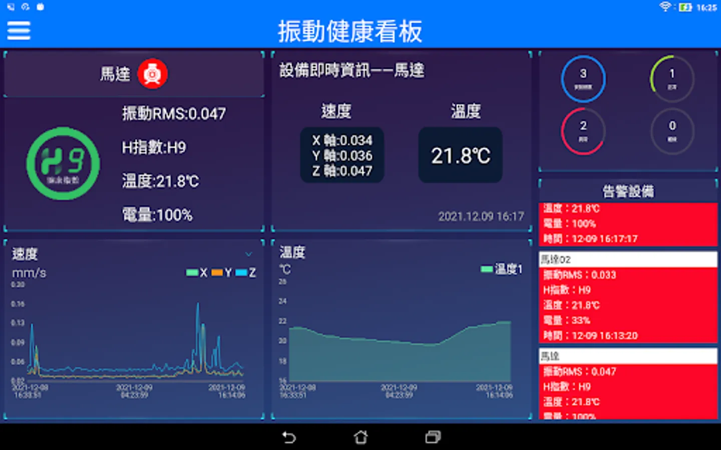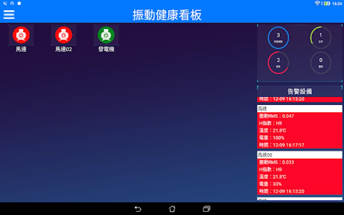 This APP is paired with the Eastcom Kanban system to display the vibration value and temperature value detected by the vibration temperature gauge VB-168 installed in each operating equipment in the system, the health index calculated by the gateway AG-868, the predicted maintenance time point and Information such as over-standard alarms; thus providing the functions of predictive maintenance and preventive measures for operating equipment in the system.