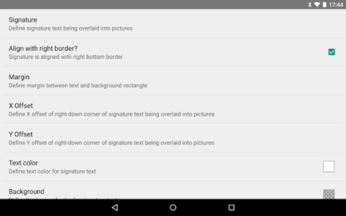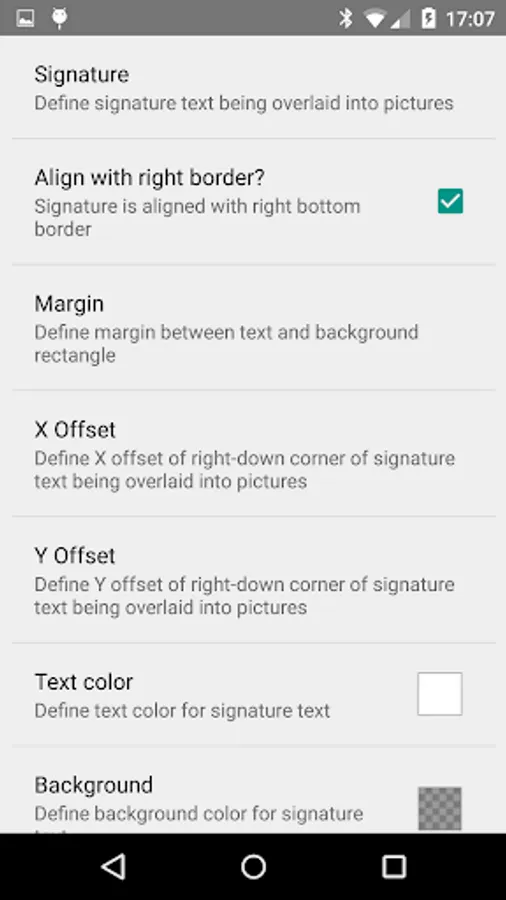 You can select between various fonts, set your own signature text, set the offset from the left or right border and change the color of the text and its background - Make the signature your own!