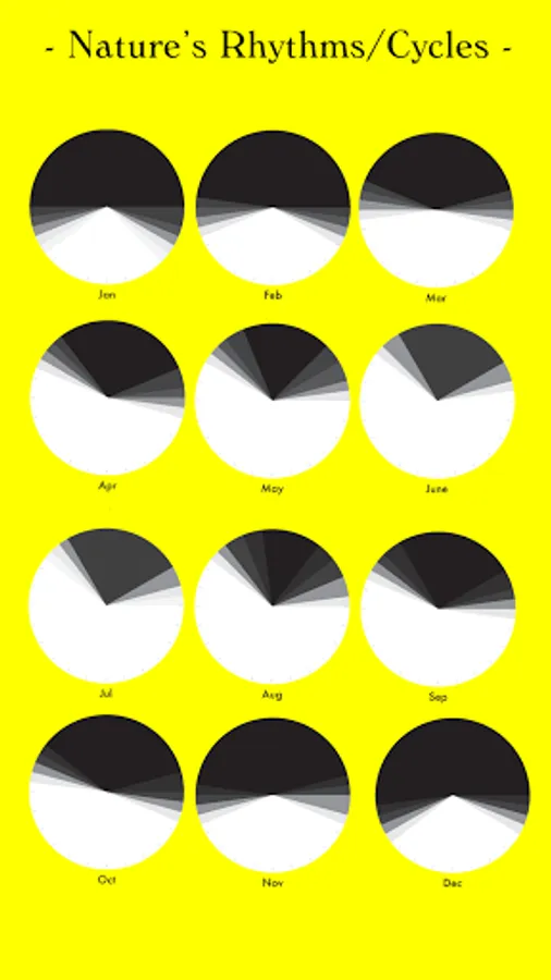 Circa Solar helps us to synchronise the intrinsic relationship between our circadian rhythms, our mental and physical health, and the geophysical rhythms of light and dark. Circa Solar visualises the critical solar information contained in fluctuating daily and seasonal sunlight cycles. Such light cycles act as the primary zeitgeber (periodic external cues capable of entraining biological rhythms) that influence and govern the behaviours and physiology of nearly all living organisms.