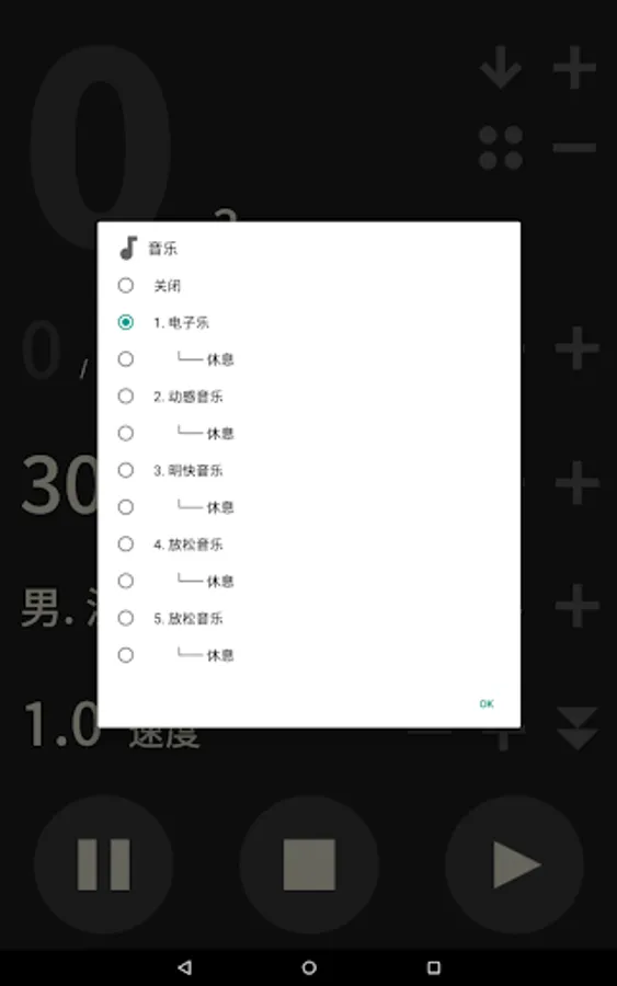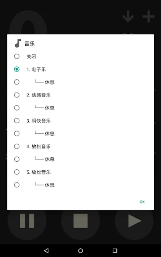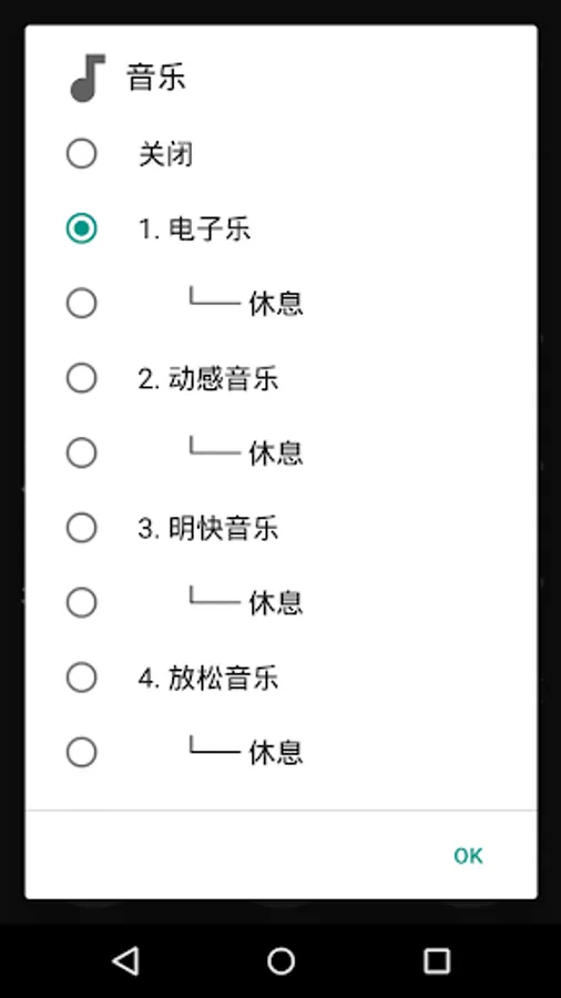 - 5种类型的音乐:电子乐、动感音乐、明快音乐、放松音乐1、放松音乐2