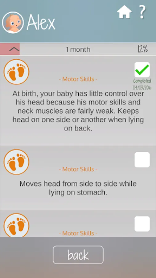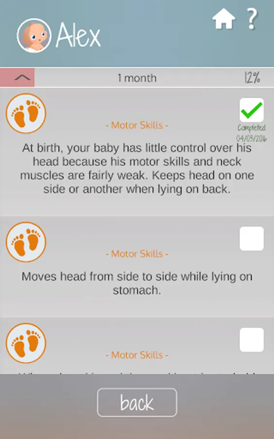 "Baby Steps" is an informative guide for parents with newborn babies and it will tell you what and when to expect. Just add your children in the list and start marking your baby's achievements. All the development steps are organized in sections like : motor skills,cognitive development,language skills, social and emotional skills.