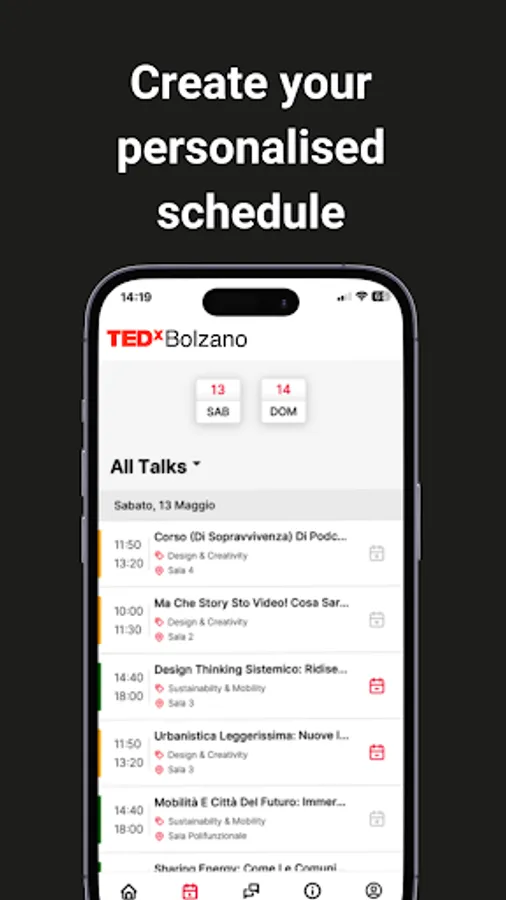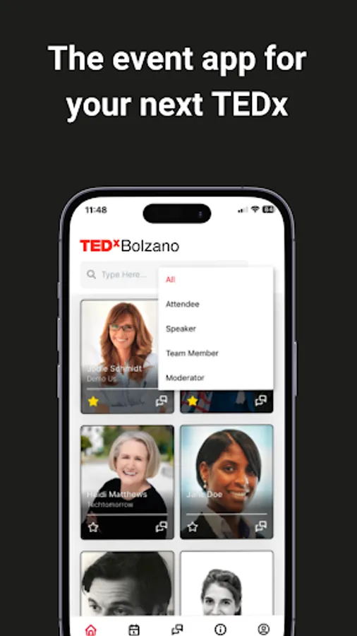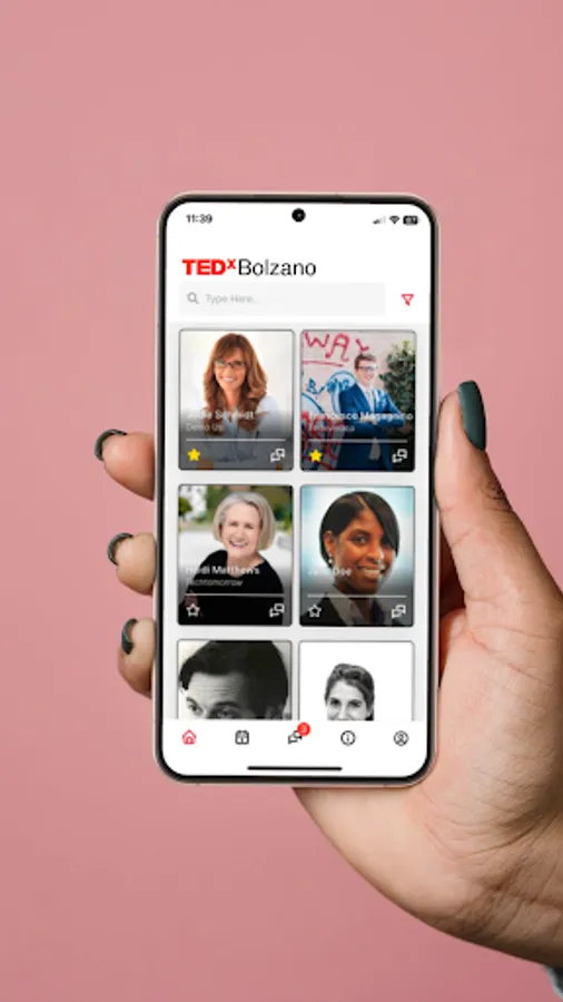 Con la app del TEDxBolzano potrete accedere a tutte le informazioni relative all'evento, come gli orari delle presentazioni, gli speaker, le informazioni sul luogo dell'evento e tanto altro ancora. Inoltre, potrete entrare in contatto con tutti i partecipanti dell'evento grazie alla funzione di networking integrata nell'app.
