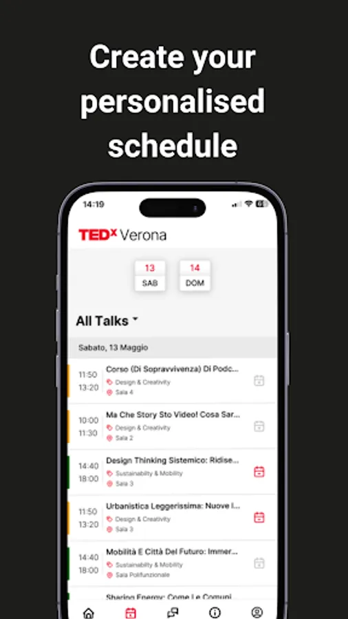 With the TEDxVerona app you can access all the information relating to the event, such as the times of the presentations, the speakers, information on the place of the event and much more. Furthermore, you will be able to get in touch with all the event participants thanks to the networking function integrated in the app.