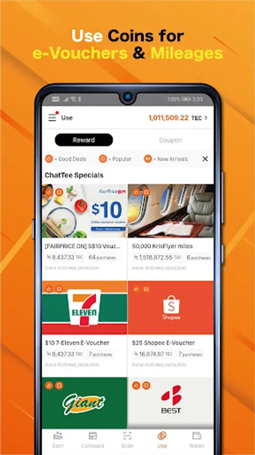 You can use ChatTee - Get Rewarded to check out the latest promotions, visit the shops to get Coinback, and enjoy various ways to earn coins and then exchange them with coupons, mileage, or use it to pay your bill!