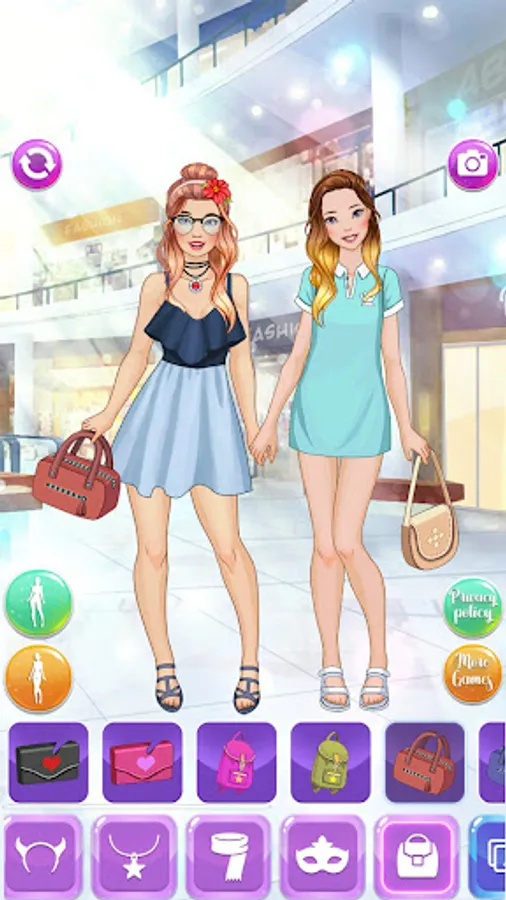 Two fashion bff are going to bff shopping. You are about to make the most glamorous make up for these cool girls and pick up fashionista hairstyle. These girls met at school and since then they are best friends and always together, so try to make them match each other. You can fully customize these bff girls appearance: pick up eyes and mouth, so the faces of these fashion bff can look different. In addition there are many glasses, facial decorations and hair accessorizes to give a twist to their personality! Probably the best makeover and dress up for girls. No matter if you’re fashion designer or fashion stylist, gather fashionista outfits for these bff girls in our dressup game! Hide the GUI with the "camera" button, grab a screenshot and share it on your social profile to show off your talents and skills to your classmates in this girl games.