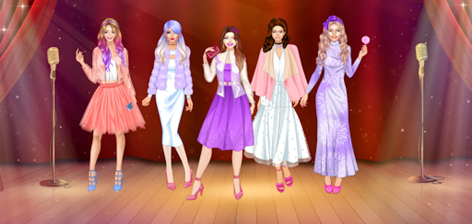 Go beyond dressing just one glam doll and style 5 incredible fashionistas at once. Begin their total fashion makeover: change facial features, skin color, hair, dress up and makeup. Each superstar girl has her own huge set of clothes.