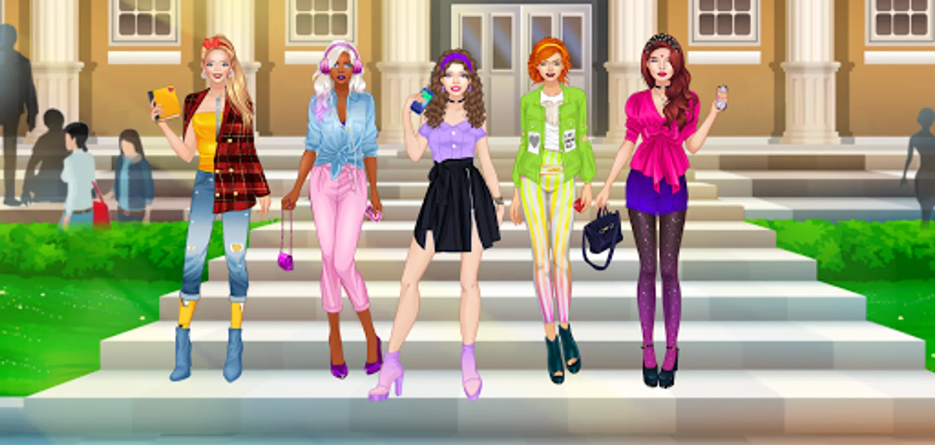 New college dress up games for girls: brand new girl squad, different locations, trendiest superstar clothes collections & cool outfit maker 👗👜👠💄! Create a whole new look for school BFFs in fashion girl games!