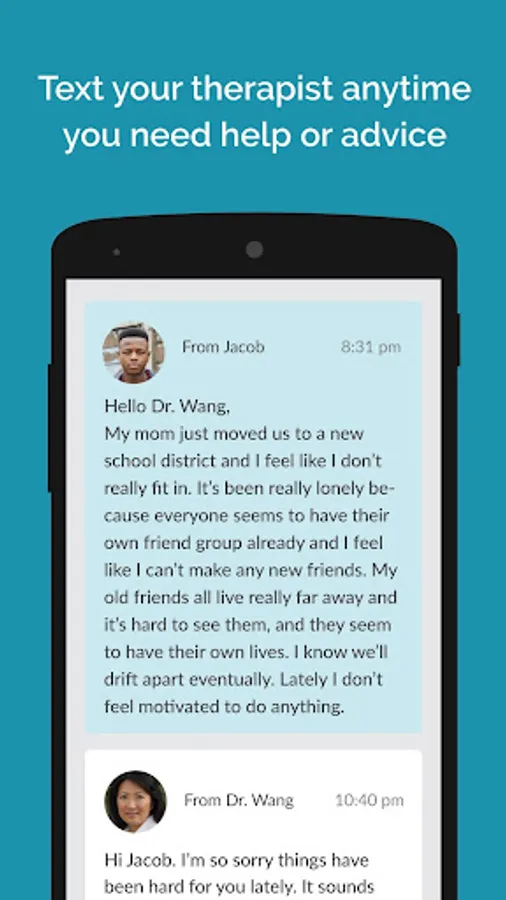Your therapist will communicate with you on the Teen Counseling app using text, phone, and video