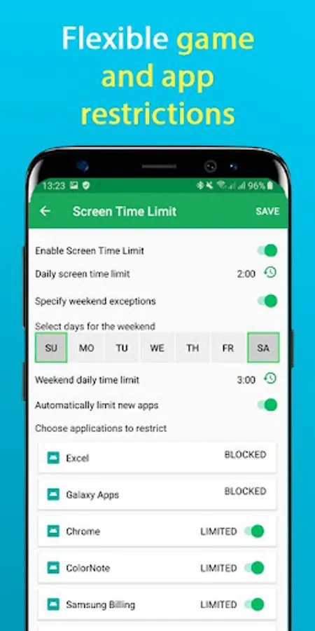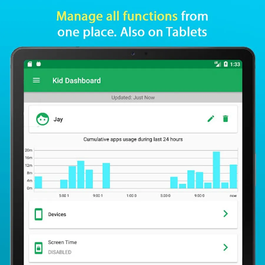 Teen Time gives you a wide range of tools to restrict usage of any games or other applications, receive device usage statistics, battery and sound status, setup screen time limits & schedules, track movement, get notifications about arrivals into preset places and many more…